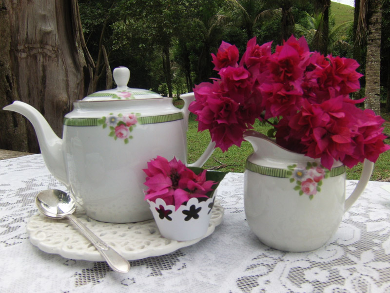 Precisava mostrar minhas novas porcelanas. Fique à vontade e sirva-se de um pequeno chá. A temperatura está mais agradável e nada como um chá.